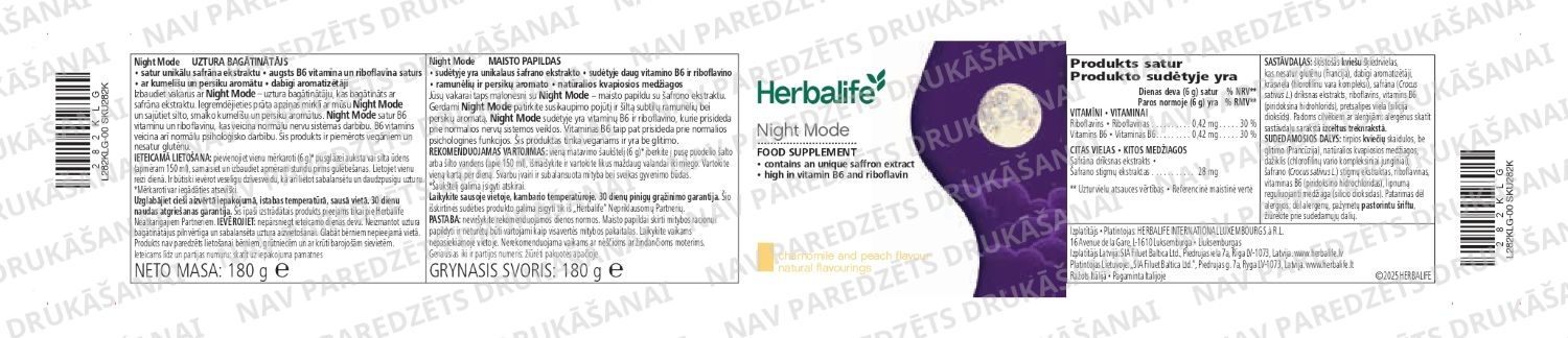 Vakara dzēriens, kas bagātināts ar unikālu safrāna ekstraktu un B grupas vitamīniem, kas, kā liecina zinātniskie pētījumi, uzlabo miega kvalitāti tikai 7 dienās*. Safrāna ekstrakts var uzlabot garastāvokli pēc pamošanās un var palīdzēt paaugstināt melatonīna līmeni, lai atbalstītu miega un nomoda ciklu**. Safrāna ekstrakts Night Mode sastāvā palīdz samazināt miega trūkuma sajūtu un miega traucējumu problēmas**.